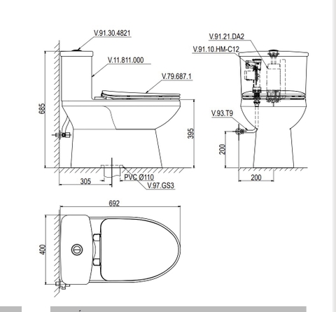 Bàn cầu một khối V811 có kích thước nhỏ gọn chỉ L675 * W401 * H675, phù hợp cho mọi diện tích và yêu cầu sử dụng.
