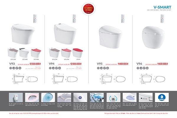 Bàn cầu thông minh V – Smart được biết đến với khả năng tích hợp nhiều tính năng tự động thông minh, dễ sử dụng. Chỉ với 11.800.000 đồng, khách hàng đã có ngay cơ hội sở hữu sản phẩm này. Xả mạnh mẽ, nhưng V–Smart siêu tiết kiệm nước, lực xả mạnh, giúp xả sạch toàn bộ chất bẩn với lượng nước chỉ từ 2.8 - 4.1L/1 lần xả.