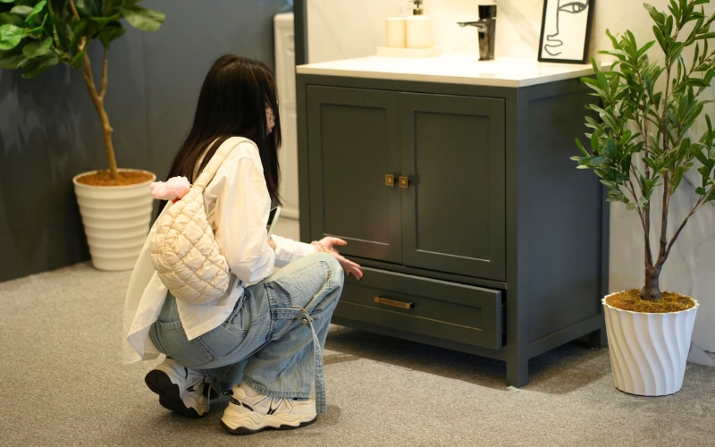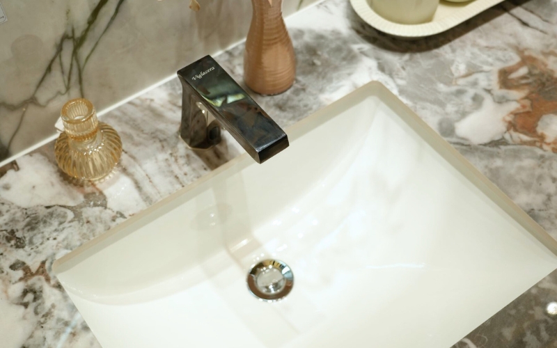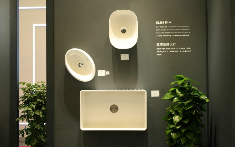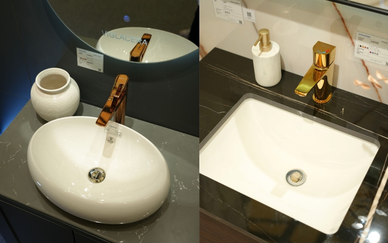 Điểm nhấn đặc biệt của triển lãm là sự kết hợp độc đáo giữa chậu sứ âm bàn và đá nung kết Vasta Stone. Công nghệ vân trong xương tạo nên giải pháp chậu bàn đá hiện đại, linh hoạt phối hợp với đa dạng phong cách tủ cabinet, phù hợp cho cả không gian phòng tắm và bếp. Đá nung kết kích thước lớn 1.600 x 3.200mm được trưng bày ấn tượng cùng tủ chậu, ốp tường và sàn phòng tắm, tạo hiệu ứng thị giác liền mạch, mở rộng không gian. Với khả năng chống thấm nước và chống trơn trượt vượt trội, sản phẩm này trở thành lựa chọn lý tưởng cho mọi không gian phòng tắm hiện đại.