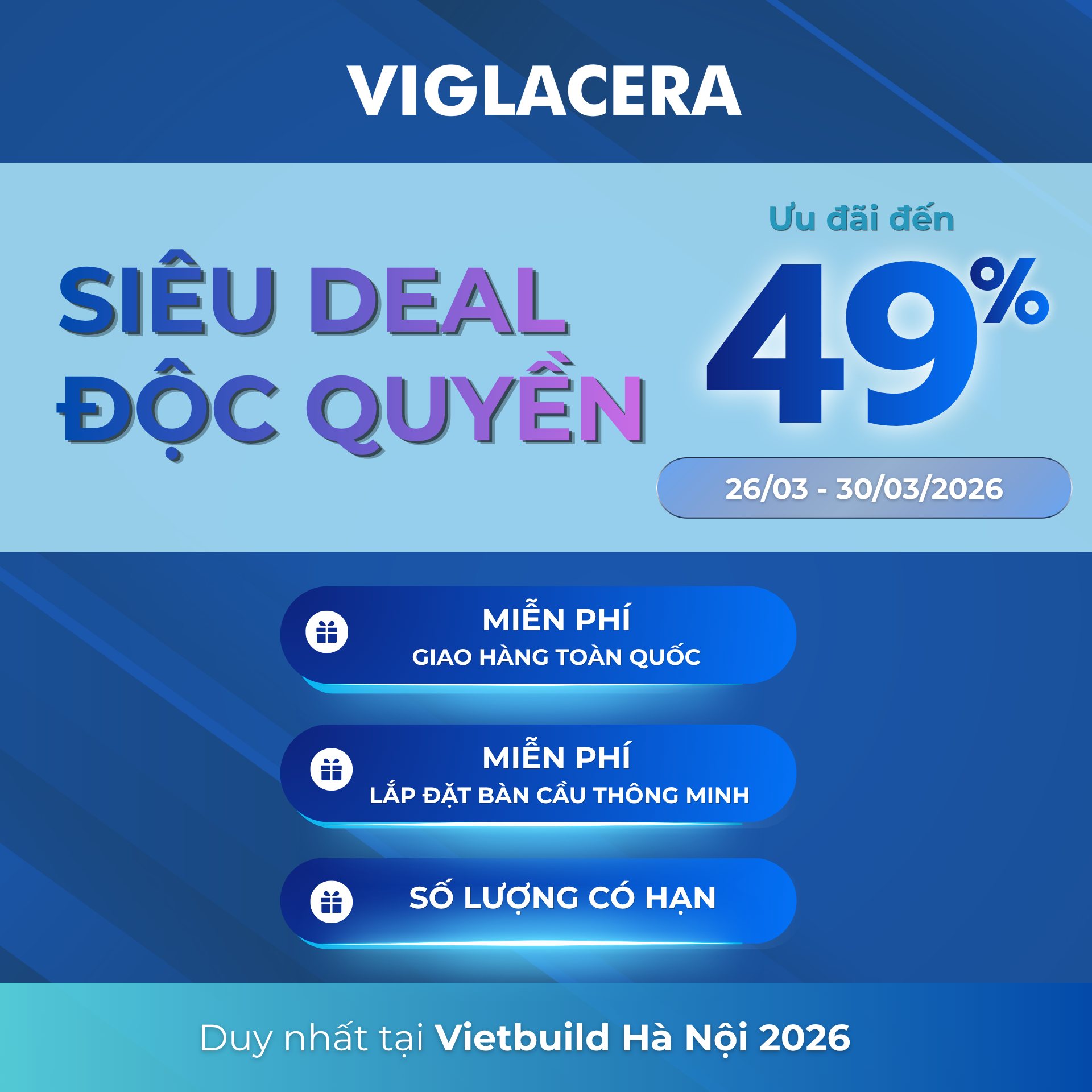 Song song với hoạt động trưng bày và trải nghiệm, Viglacera triển khai chương trình ưu đãi đặc biệt, chỉ áp dụng trong thời gian diễn ra triển lãm từ 26/03 – 30/03/2026.