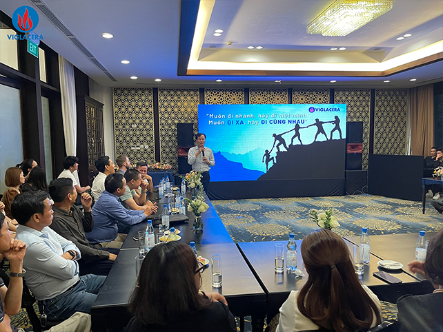 Kết thúc là Kế hoạch triển khai kinh doanh trong Quý IV/2022 do anh Nguyễn Việt Cường – Phó Tổng giám đốc Công ty Cổ phần Thương mại Viglacera chia sẻ và tổng kết buổi gặp mặt. Qua buổi gặp mặt Công ty CP thương mại Viglacera luôn trân trọng sự đồng hành của hệ thống Nhà phân phối, coi đây là cầu nối gắn kết để đồng hành cùng nhau hoàn thành mọi nhiệm vụ và mục tiêu đã đặt ra.